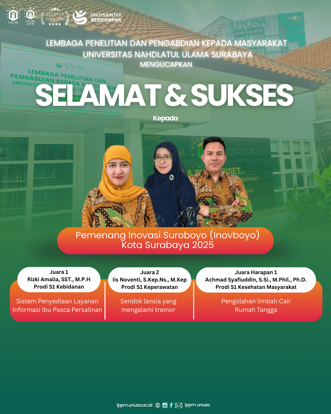 | 5 | Em4. Persentase penelitian/pengabdian masyarakat yang menghasilkan HKI masing-masing prodi | Em4 = THKI/Tpenelitian/PkM ___________________ THKI = Jumlah HKI Tpenelitian/PkM = Jumlah penelitian atau PkM | IKU 5. Jumlah keluaran dosen yang berhasil mendapat rekognisi internasional atau diterapkan oleh masyarakat/industri/pemerintah per jumlah dosen. | UNUSA (Tambahan) | 100% | 100% (214/214*100) | KLIK DISNI |