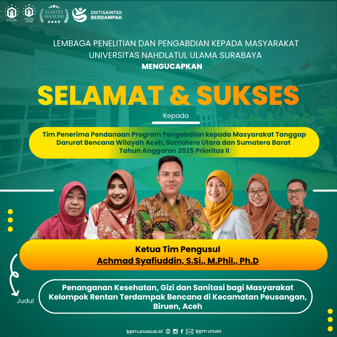 Surabaya – Lembaga Penelitian dan Pengabdian kepada Masyarakat (LPPM) Universitas Nahdlatul Ulama Surabaya (UNUSA) kembali menunjukkan komitmennya dalam merespons kebutuhan masyarakat melalui kegiatan pengabdian kepada masyarakat. Pada tahun anggaran 2025, salah satu tim dosen UNUSA memperoleh pendanaan Program Pengabdian kepada Masyarakat Tanggap Darurat Bencana dari Kementerian Pendidikan Tinggi, Sains, dan Teknologi (Kemdiktisaintek) yang difokuskan untuk penanganan bencana yang saat ini sedang terjadi.